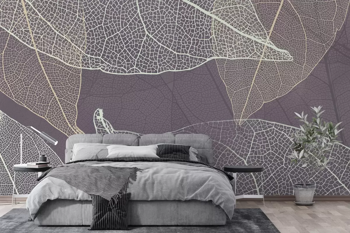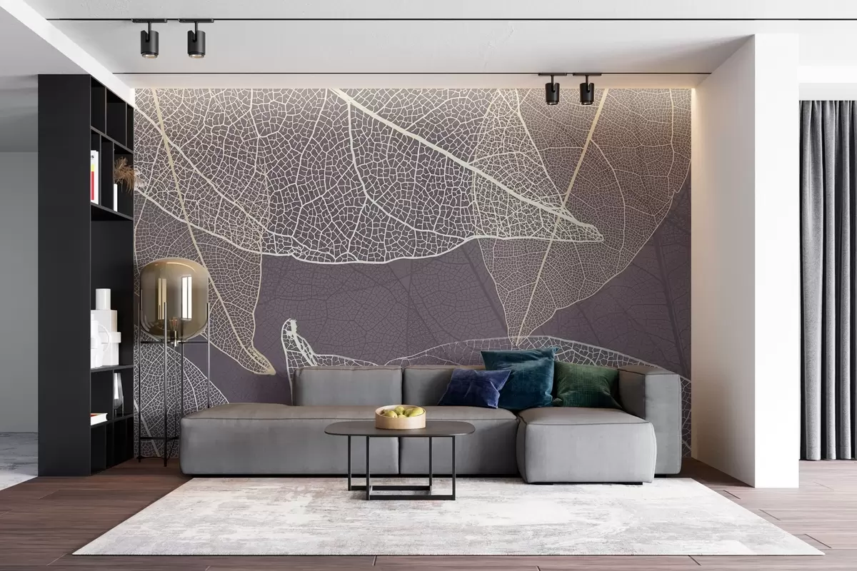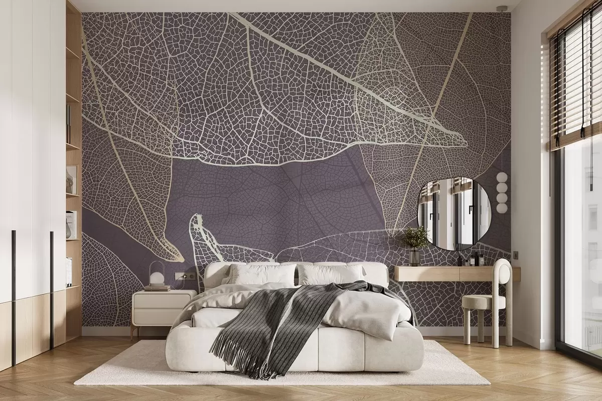 Papier peint gros plan de feuilles dont les nervures sont dans les tons gris-violet N° w02520v3
