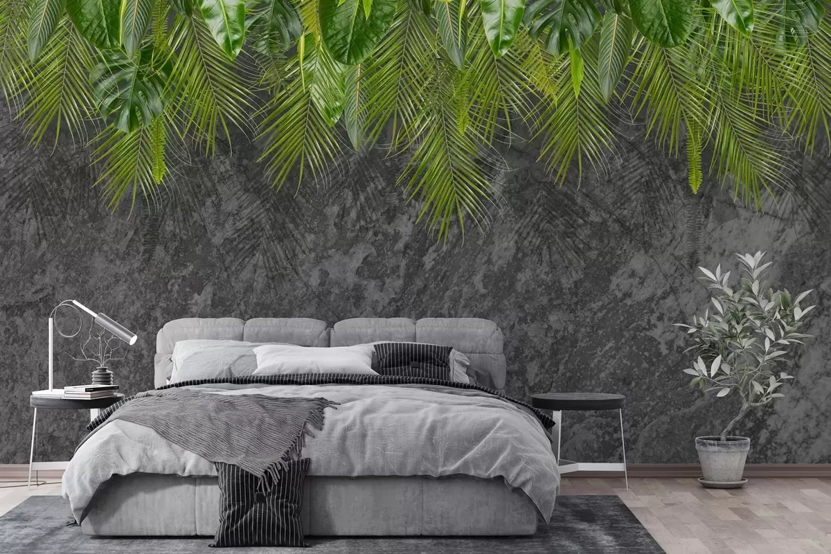 Papier peint feuilles tropicales sur fond d'imitation de pierre N° w02547