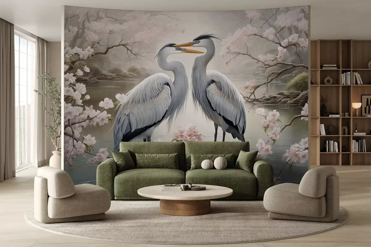 Papier peint Un couple de cigognes dans un jardin fleuri N° w02621