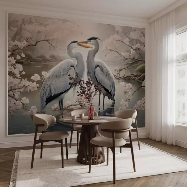 Papier peint Un couple de cigognes dans un jardin fleuri N° w02621