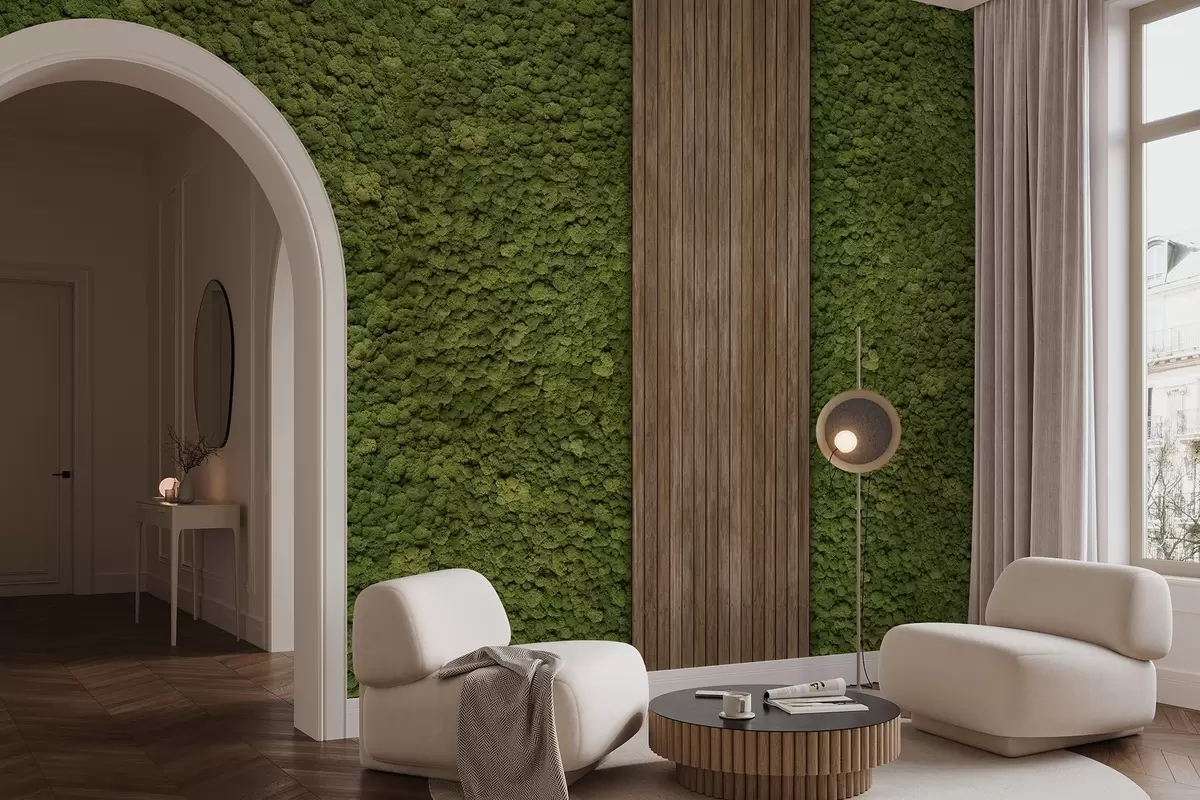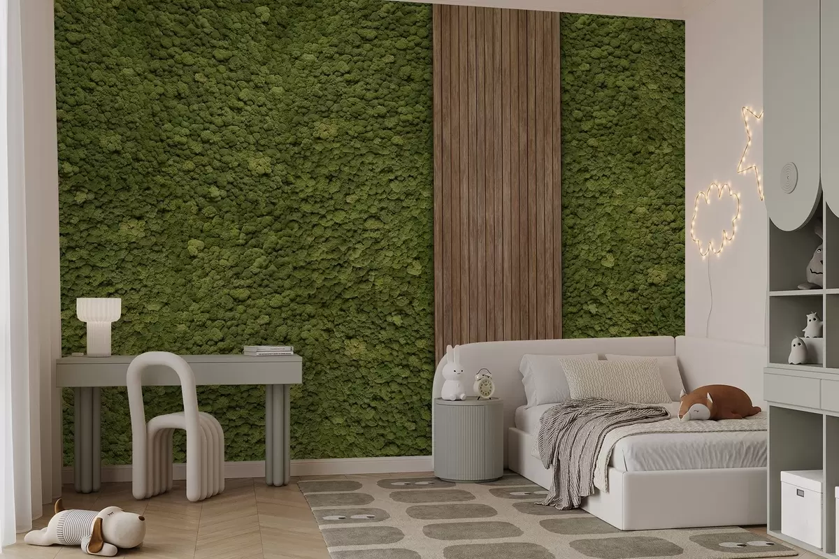 Papier peint Mur de style mousse avec panneau de bois, couleurs olive luxuriantes N° w02656v3
