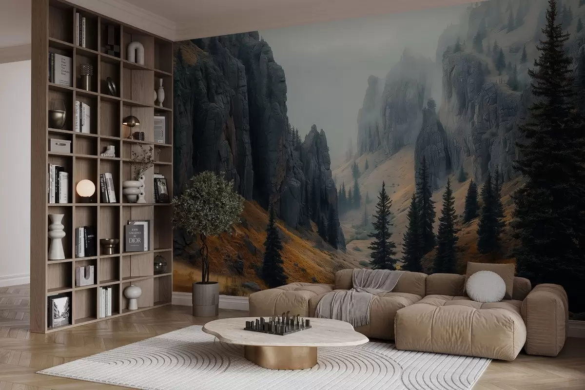 Papier peint paysage mystique avec des rochers et des sapins N° w02682