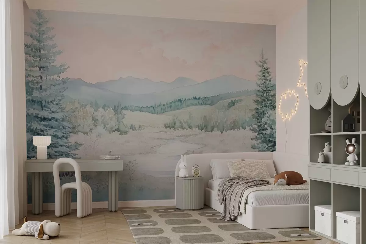 Papier peint paysage en style aquarelle avec des sapins N° w02689