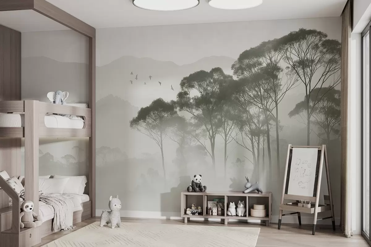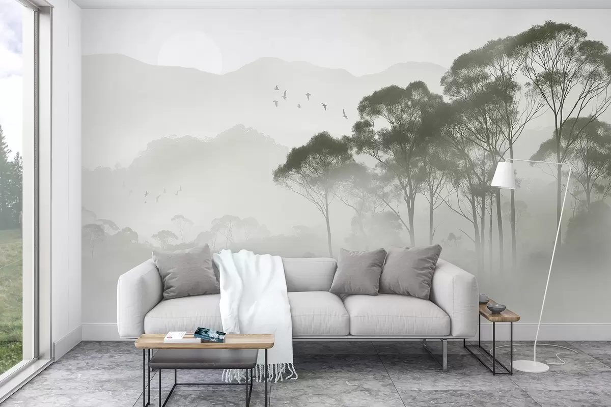 Papier peint Arbres dans le brouillard, paysages de la nature, oiseaux, soleil, couleurs vertes N° w02740