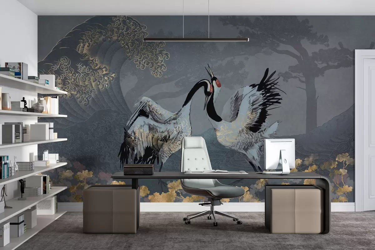 Papier peint Grues, arbres et vagues avec des éléments de style chinois N° w02747