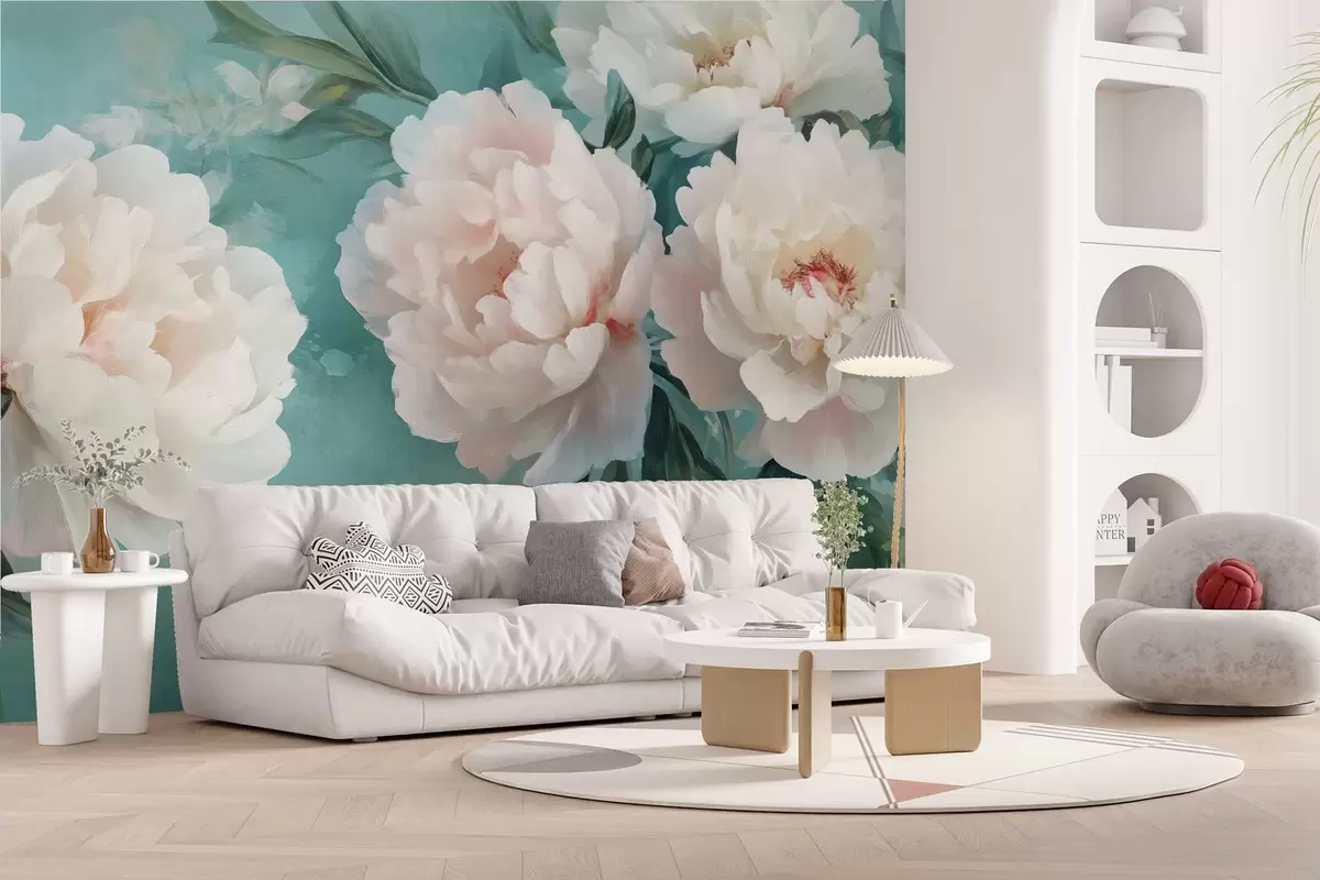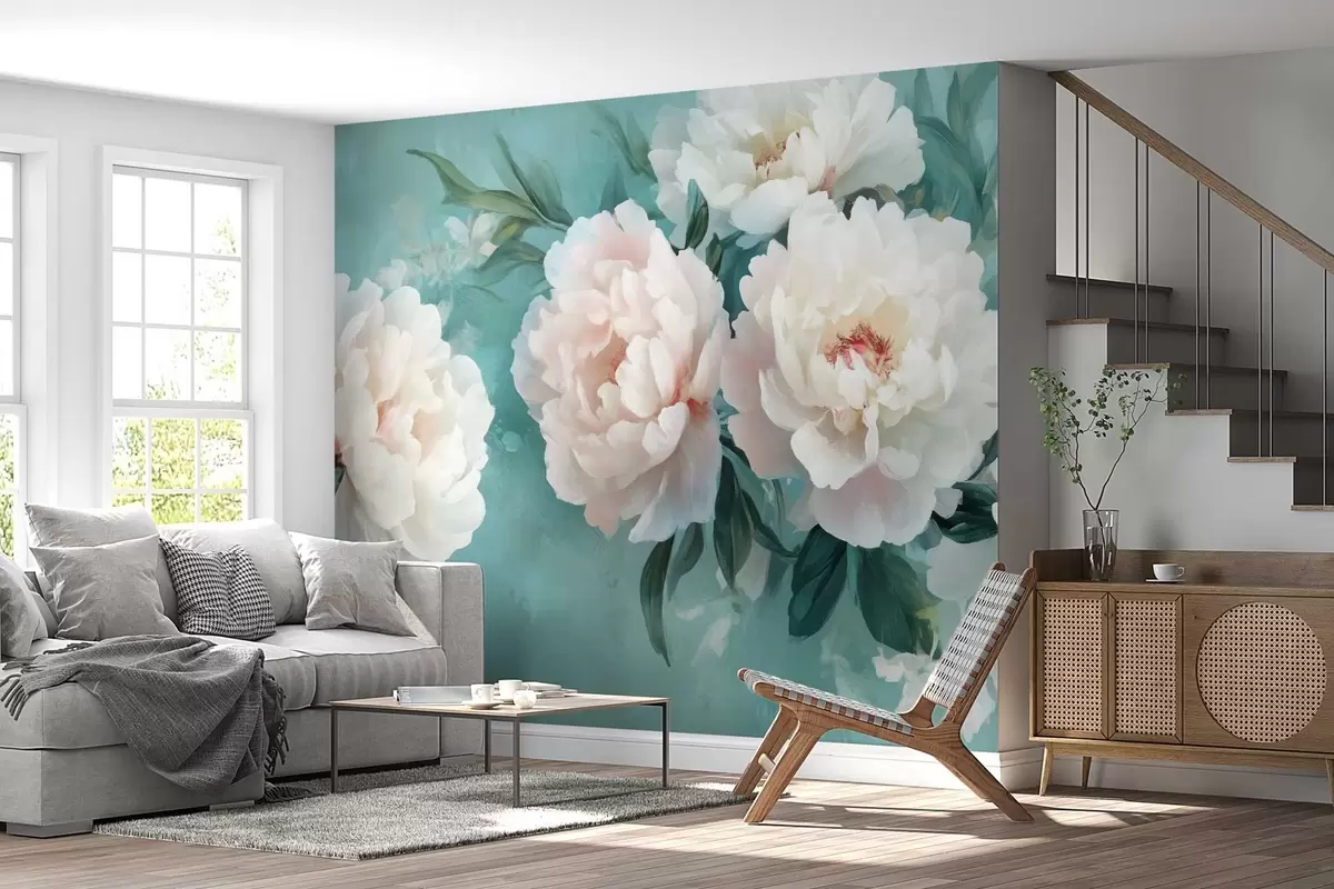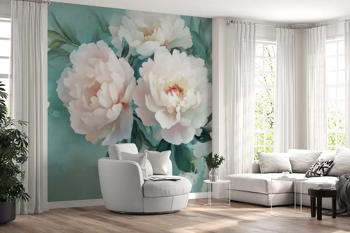 Papier peint grandes fleurs de pivoines luxuriantes sur fond turquoise N° w02763