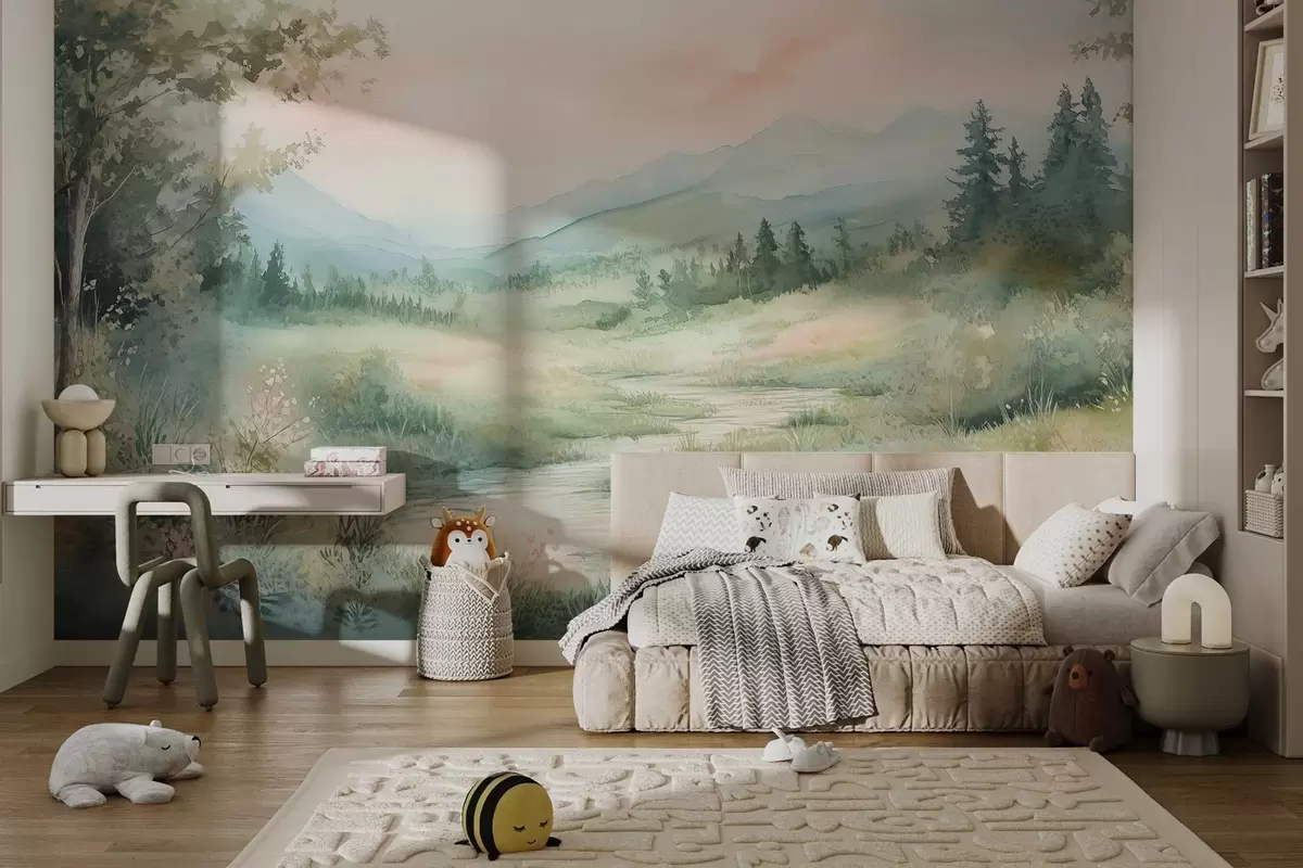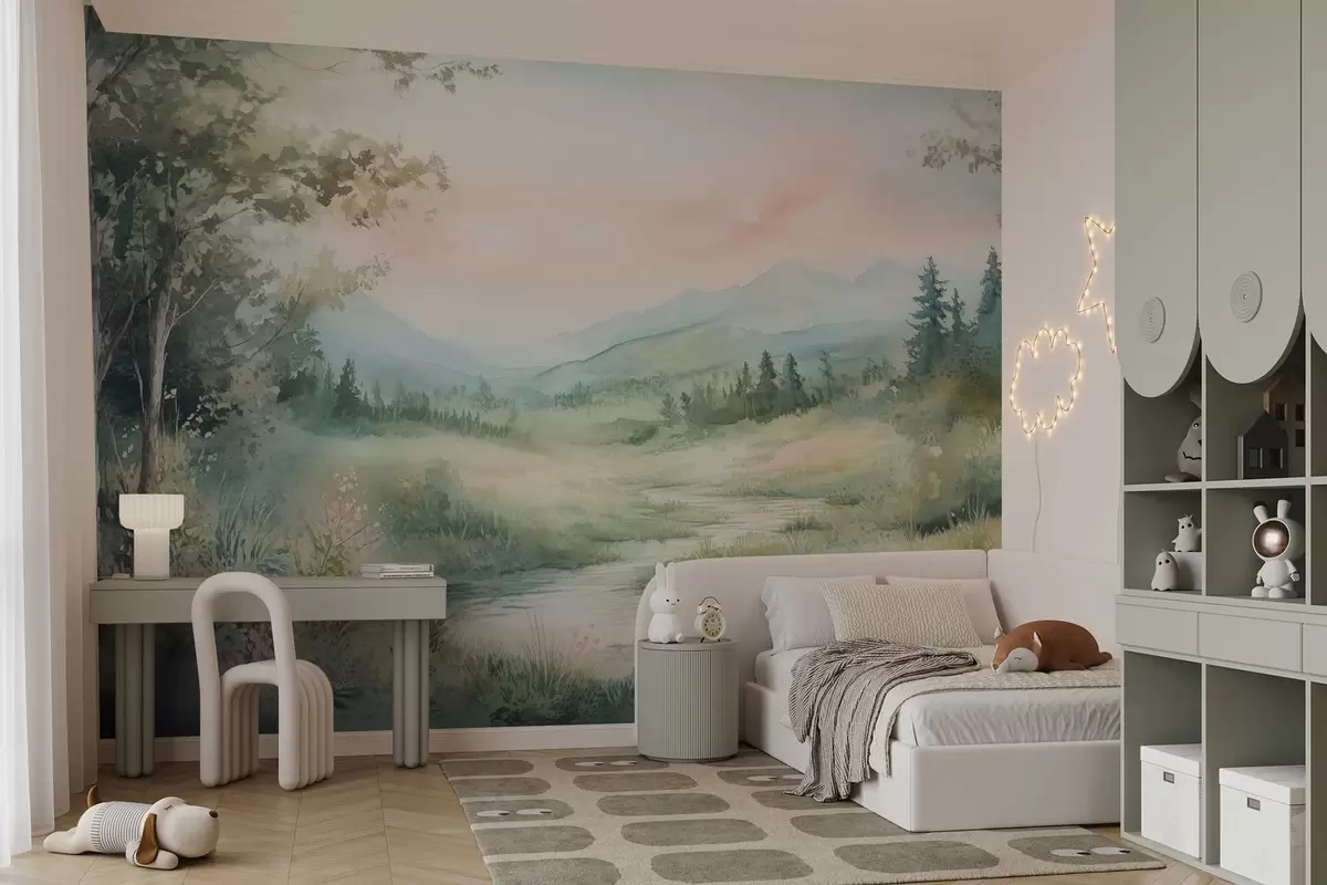 Papier peint paysage aquarelle avec un chemin et des montagnes N° w02764