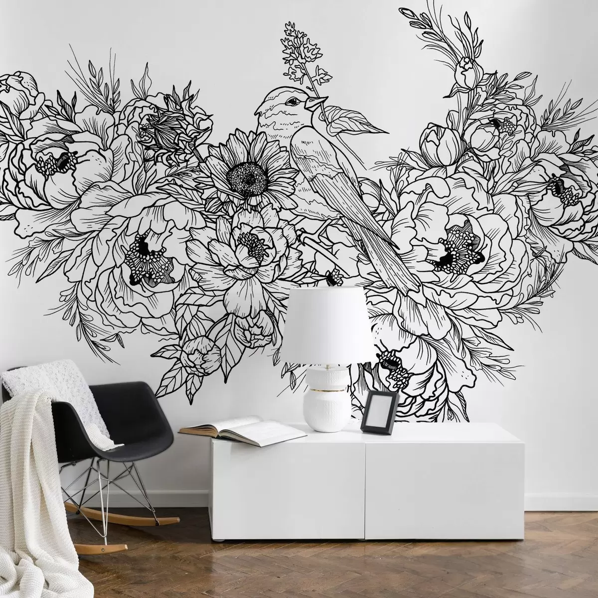 Papier peint Dessin au trait détaillé d'un oiseau et d'un arrangement floral N° w02833v1