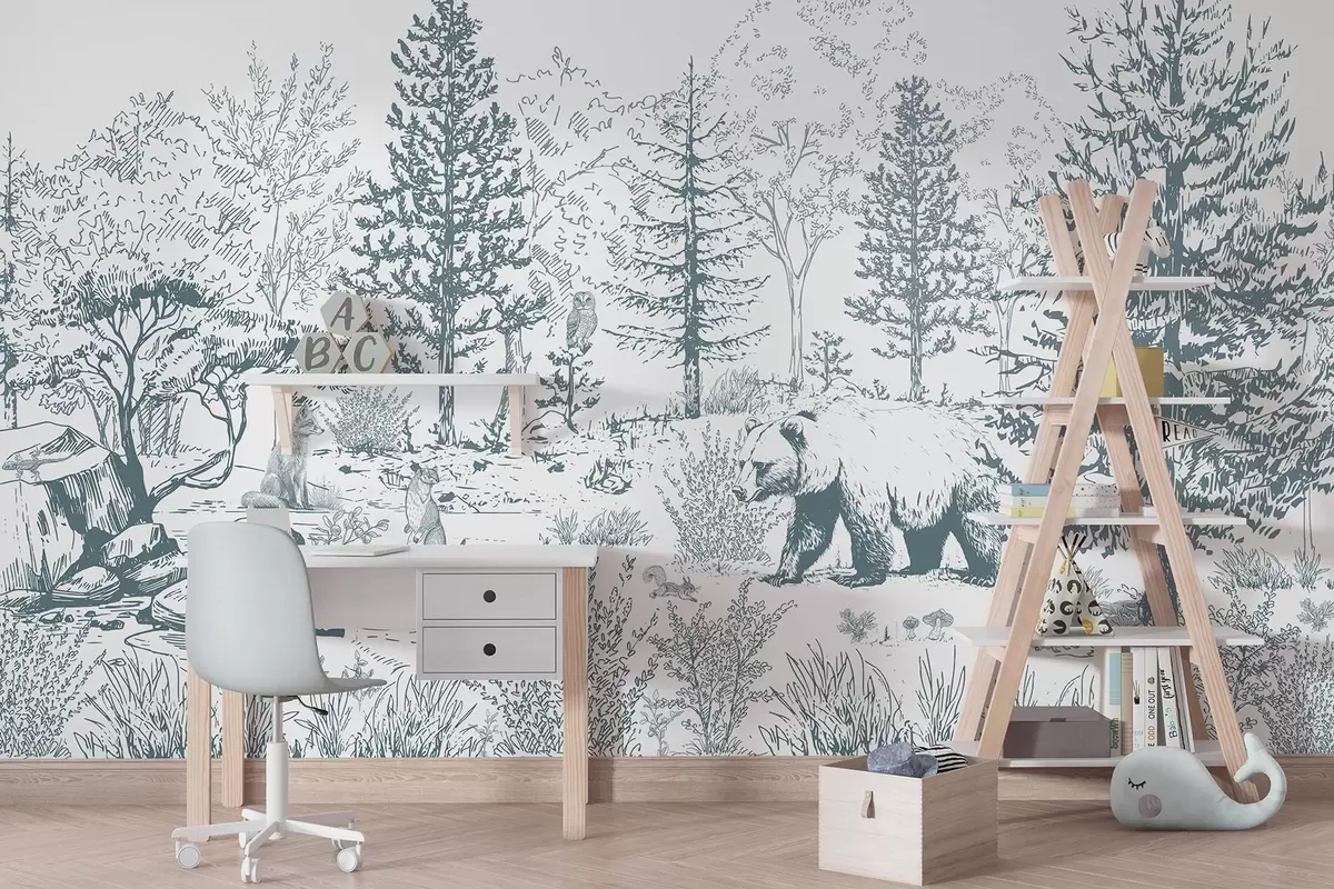 Papier peint Vie de la forêt, arbres, animaux sauvages, ours, renard, hibou, buissons, dessin au crayon, couleurs bleues N° w02929v1