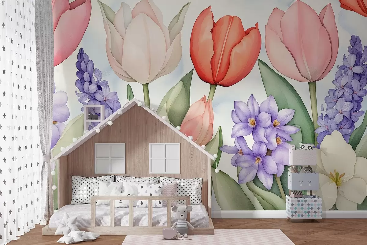 Papier peint Fleurs de printemps, tulipes, jacinthe, dessin de style aquarelle, floral N° w02940