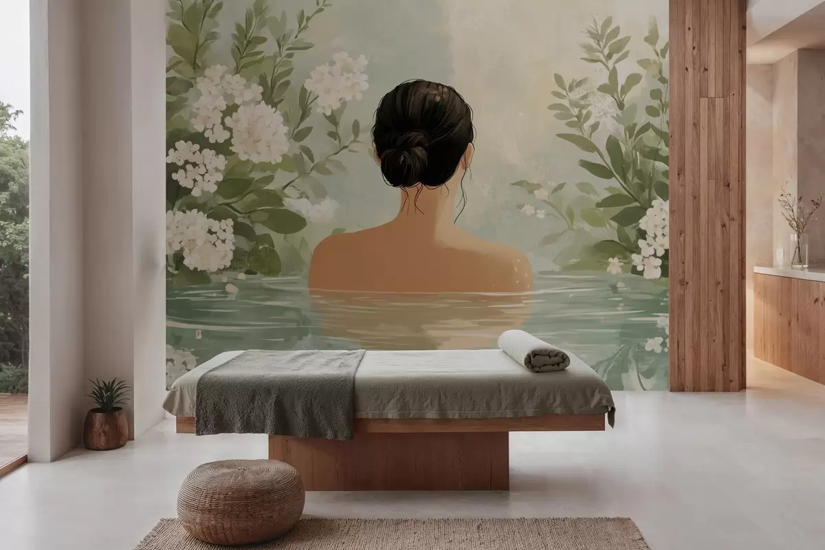 Papier peint illustration botanique sereine et rêveuse d'une femme se baignant dans une étendue d'eau calme et réfléchissante, entourée de verdure luxuriante et de délicates fleurs blanches. N° w03014