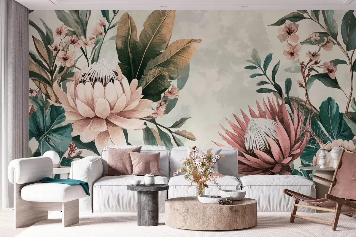 Papier peint des plantes exotiques, des feuilles de palmier et des fleurs de protea inspirées par des N° w03015