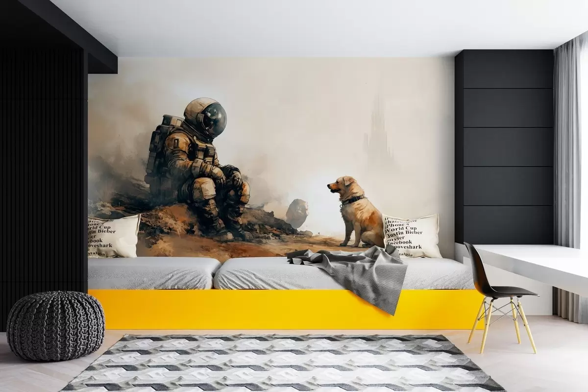 Papier peint paysage post-apocalyptique avec un astronaute et un chien N° w03115