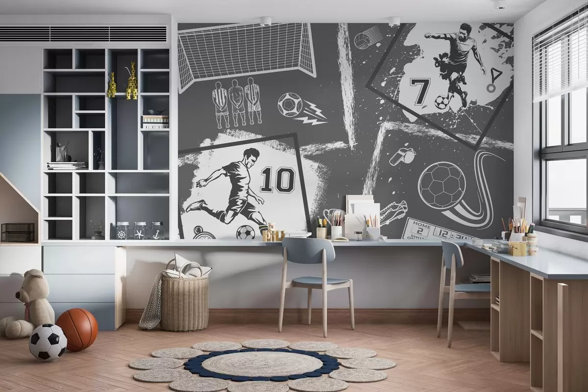 Papier peint Joueurs de football, ballon et autres attributs du football en tons gris N° w03122v1