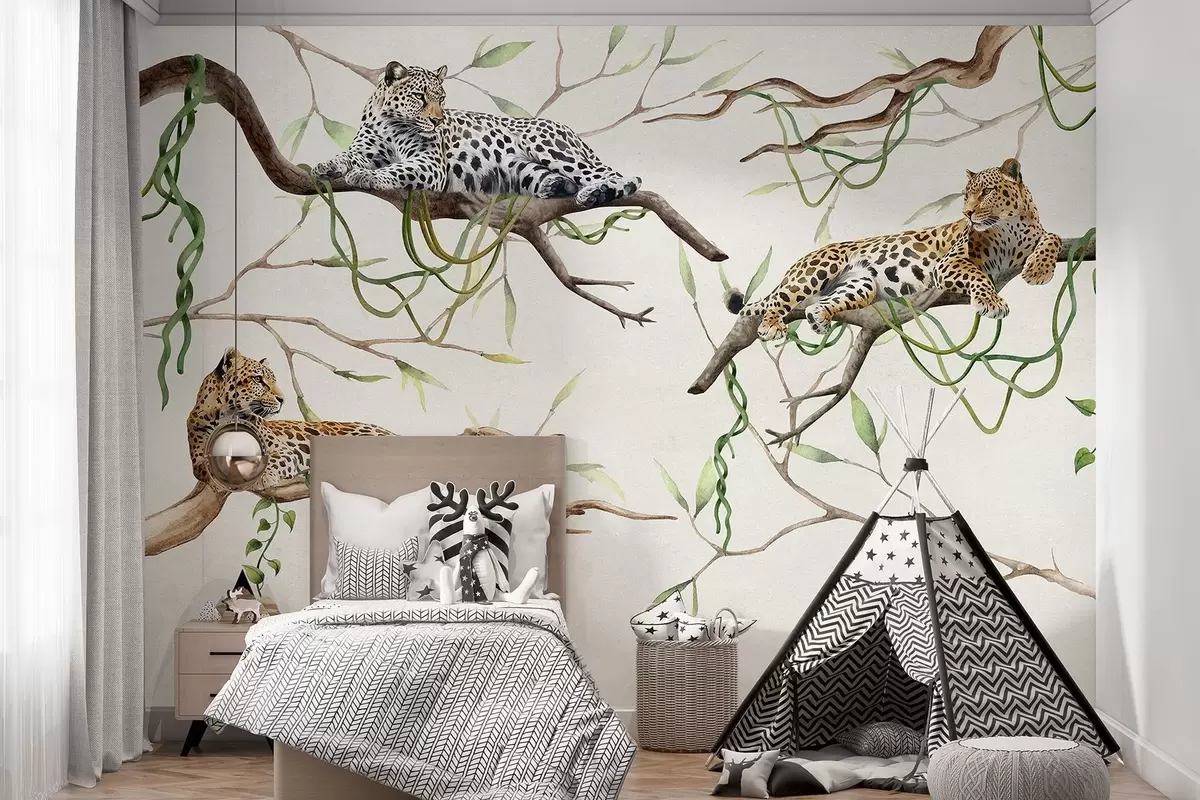 Papier peint Léopards sur les arbres de la jungle, lianes, tropical, animaux sauvages, palette de couleurs naturelles N° w03146