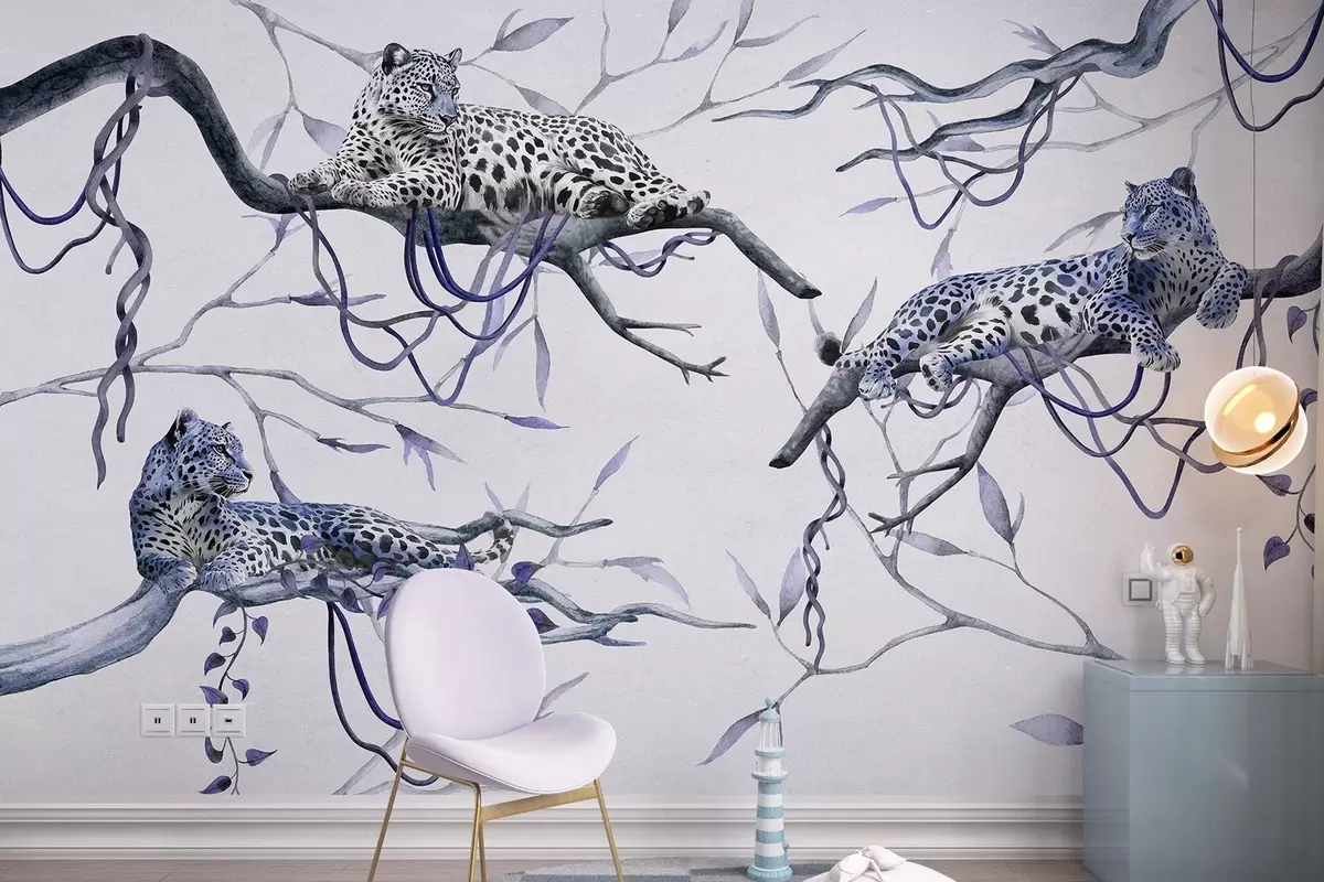 Papier peint Léopards sur les arbres de la jungle, lianes, tropical, animaux sauvages, palette de couleurs violettes N° w03146v3