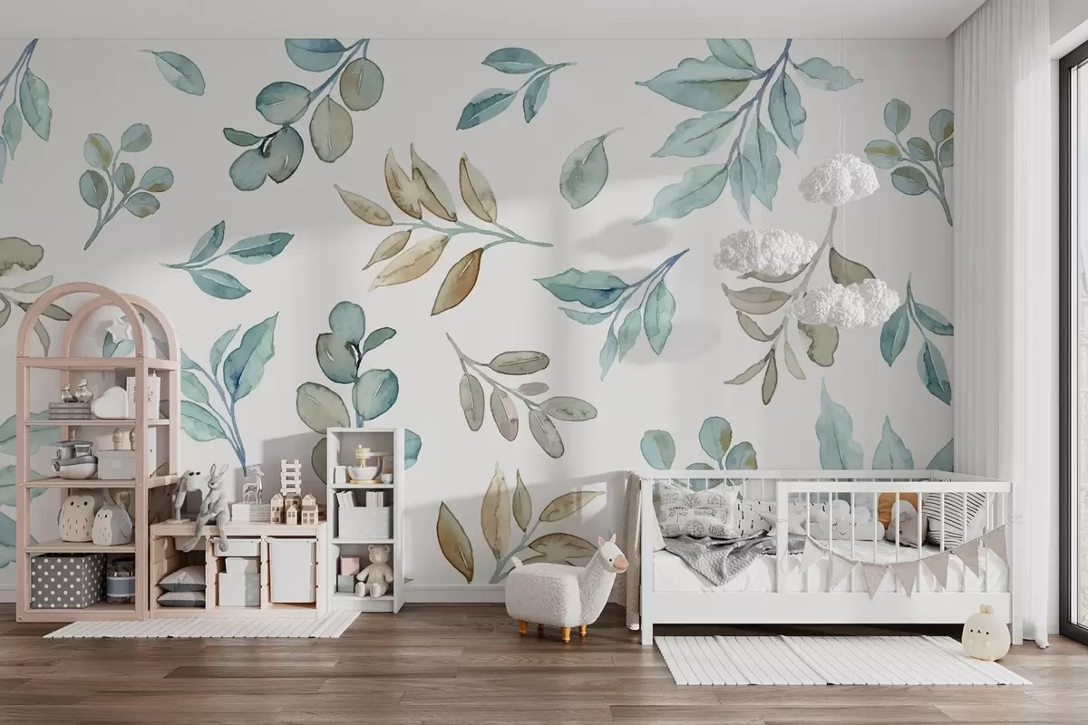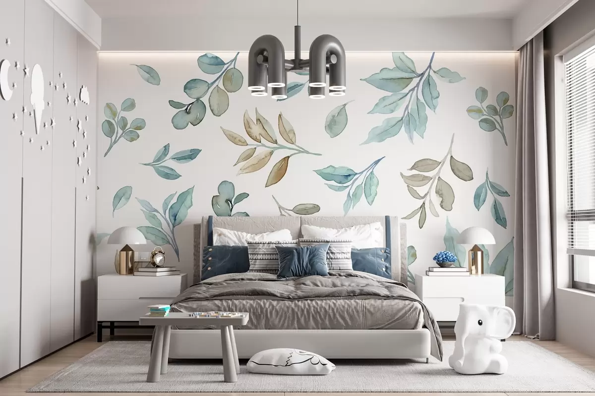 Papier peint diverses feuilles et branches en technique d'aquarelle dans les tons bleus et beiges sur fond blanc N° w03280