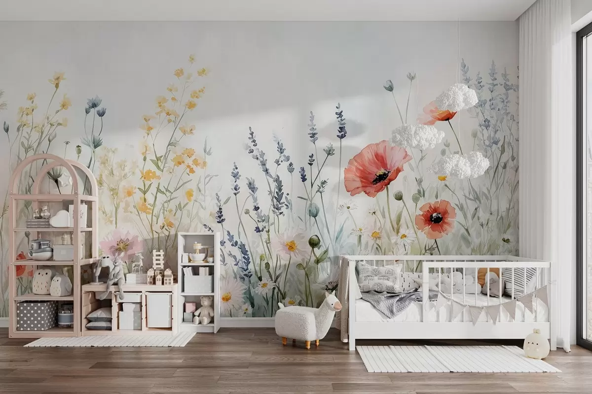 Papier peint fleurs sauvages et coquelicots dans la technique des traits N° w03281