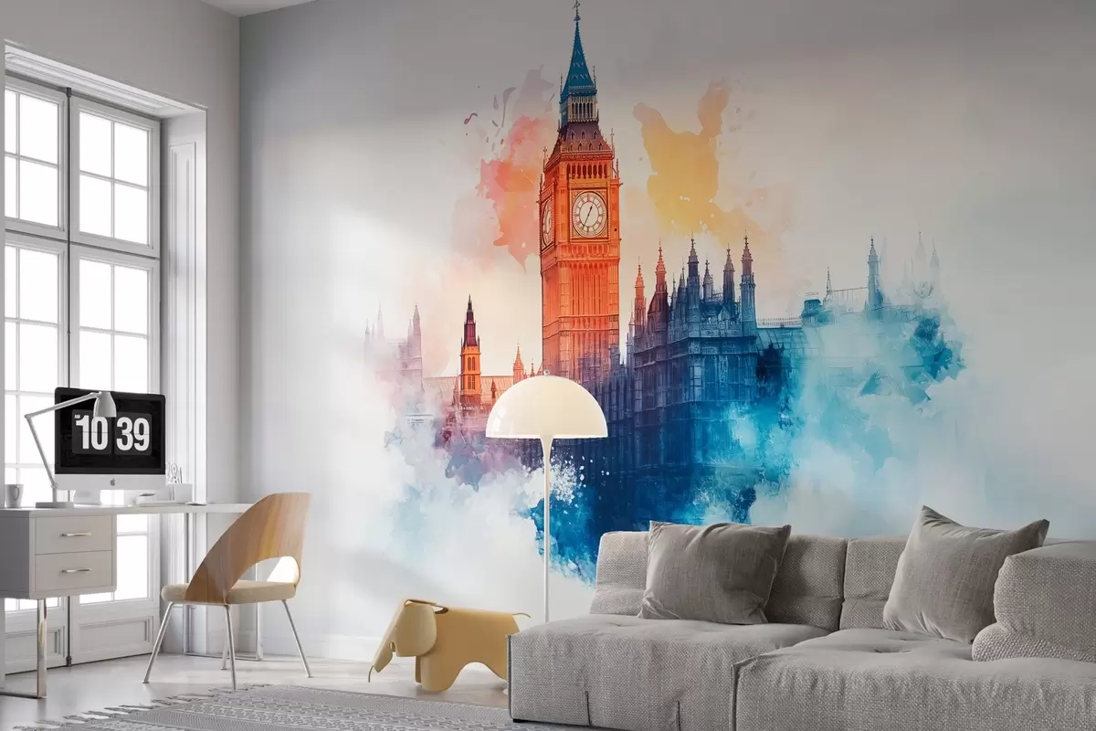 Papier peint dessin à l'aquarelle de Big Ben sur fond clair N° w03287