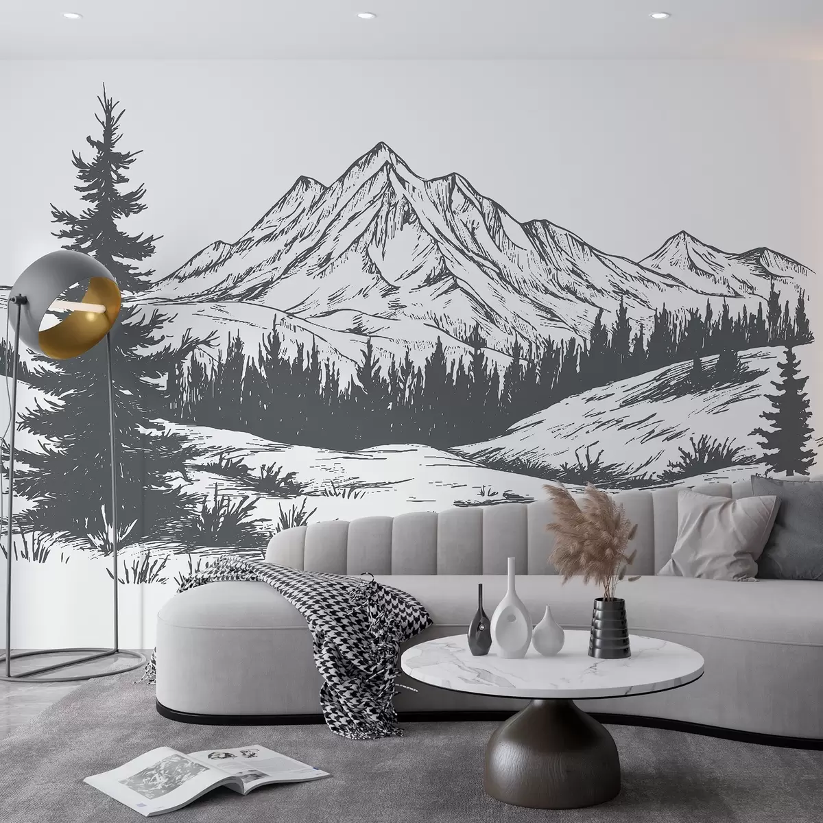 Papier peint Paysage de montagnes avec pins, forêt, nature, couleur gris foncé N° w03344