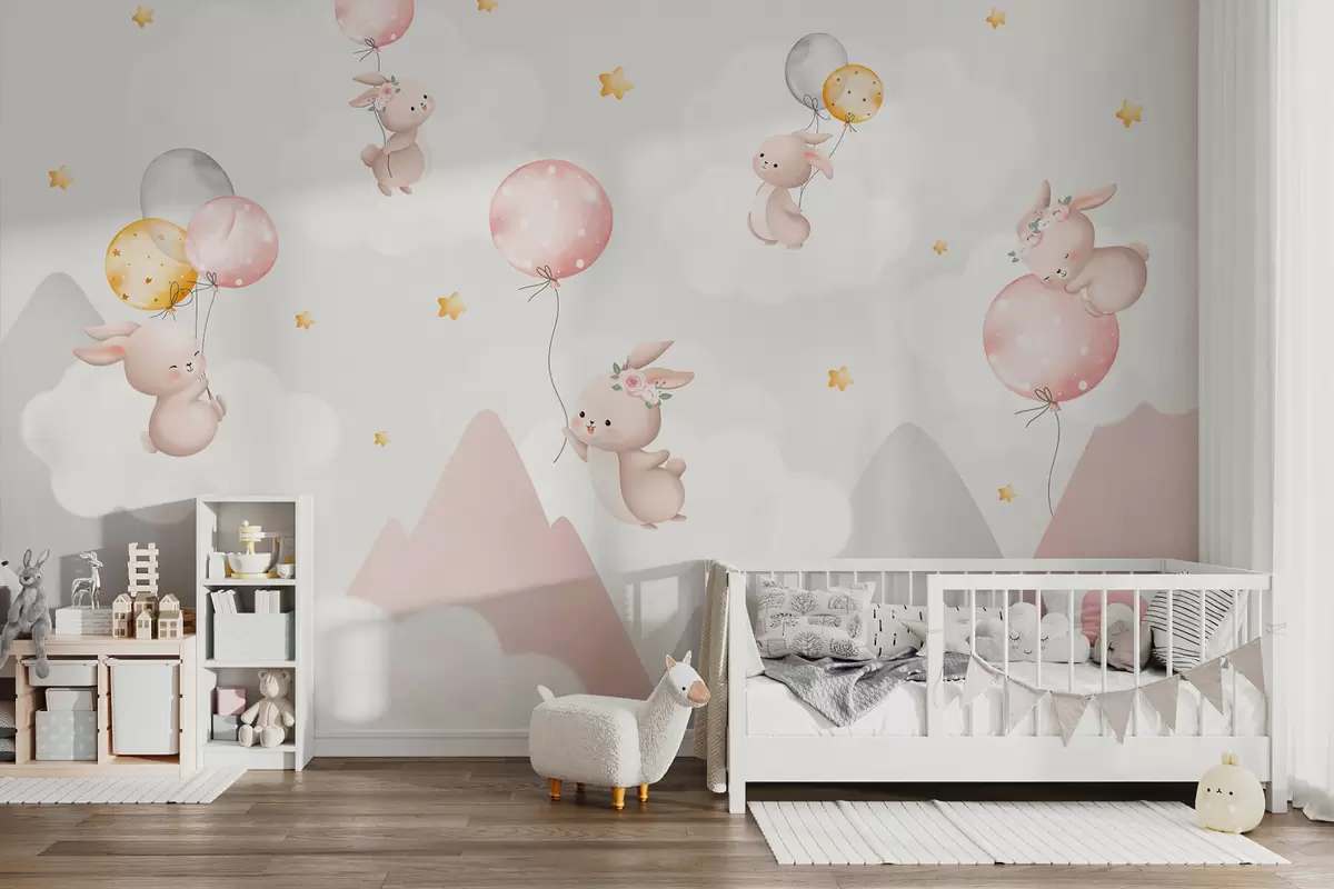 Papier peint Lapins avec des ballons sur des nuages parmi des pics montagneux N° w03375