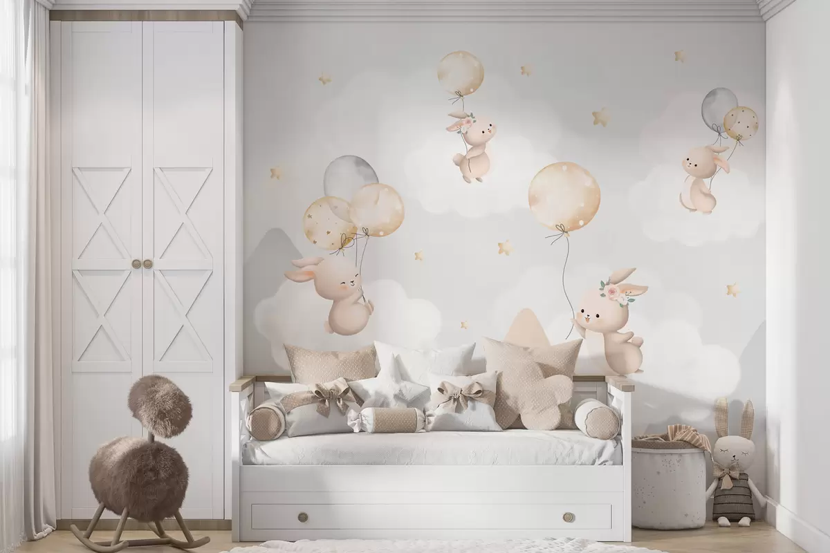 Papier peint Lapins avec des ballons sur des nuages parmi des pics montagneux N° w03375v1
