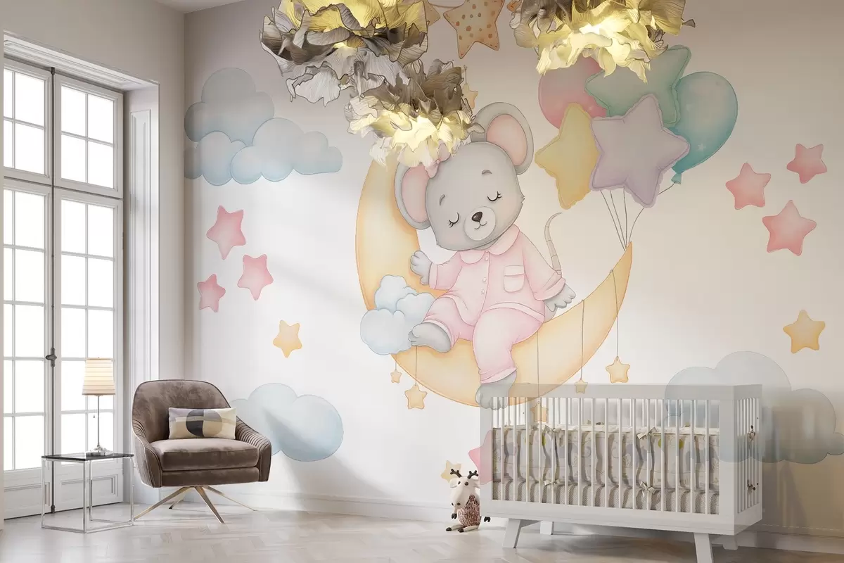 Papier peint Adorable illustration d'une petite souris endormie sur la lune, entourée d'étoiles, de nuages et de ballons N° w03380