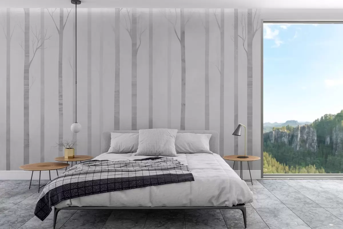 Papier peint Troncs d'arbres dans le brouillard en niveaux de gris N° w03386