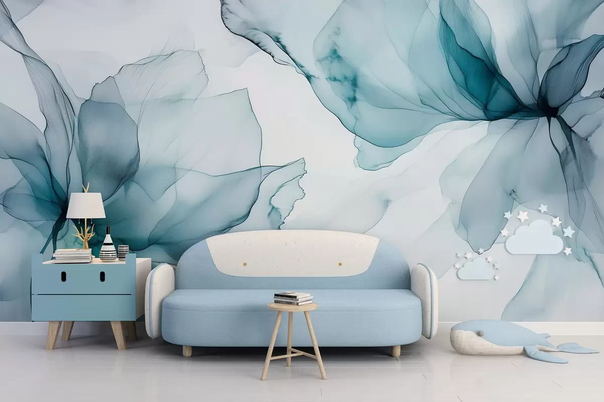 Papier peint Fleurs de style fluide, abstraction florale, aquarelle, palette de couleurs bleues N° w03406v2