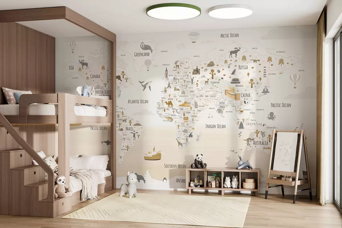 Papier peint Carte du monde avec animaux et points de repère N° w03410v1
