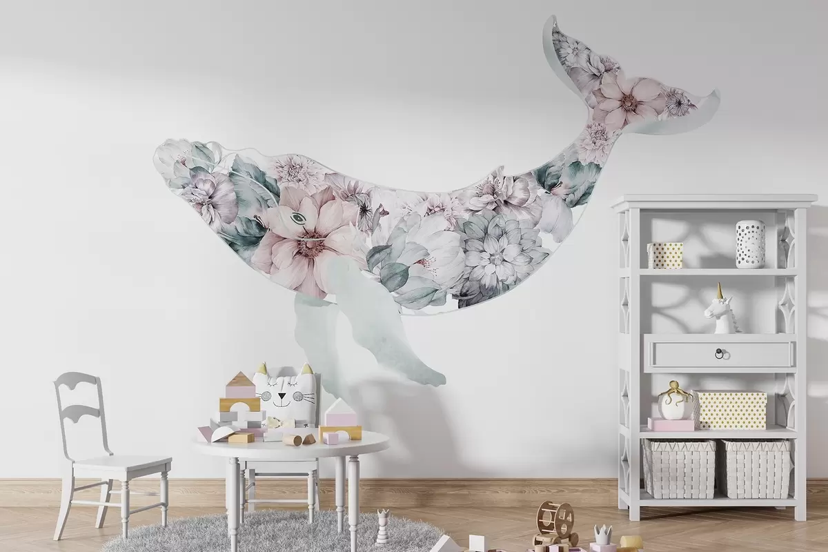 Papier peint Belle baleine avec fleurs aquarelles, animaux marins N° w03445v1