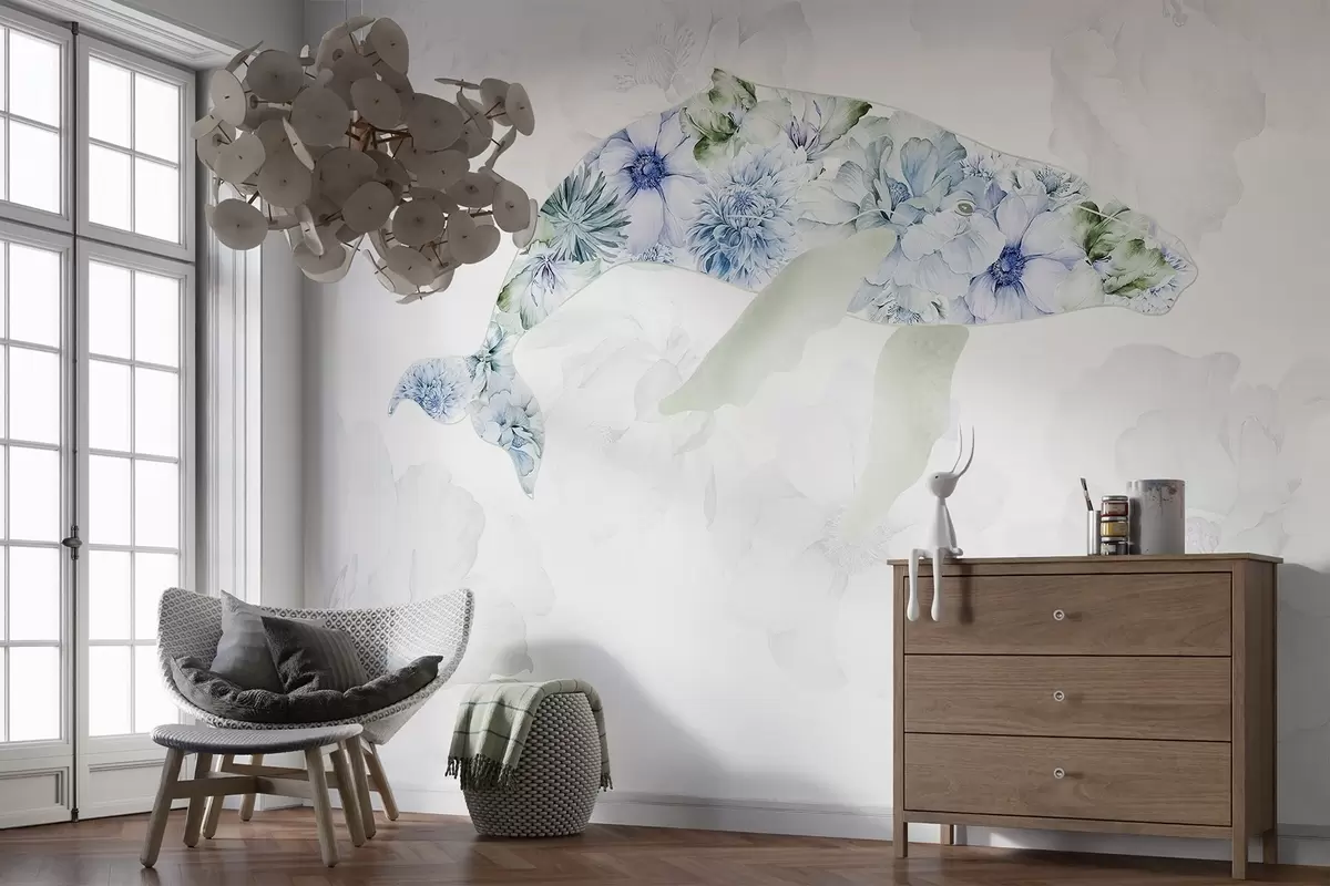 Papier peint Baleine avec fleurs aquarelles, animaux marins, minimalisme, bleu et vert N° w03446v2