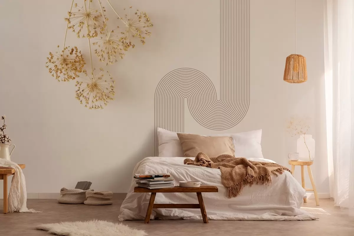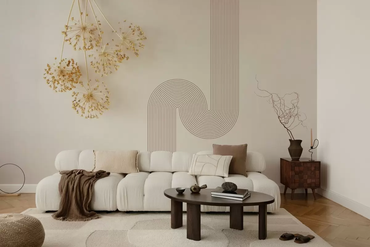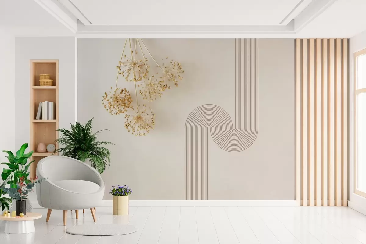 Papier peint élégantes fleurs séchées et lignes dans les tons beiges N° w03455