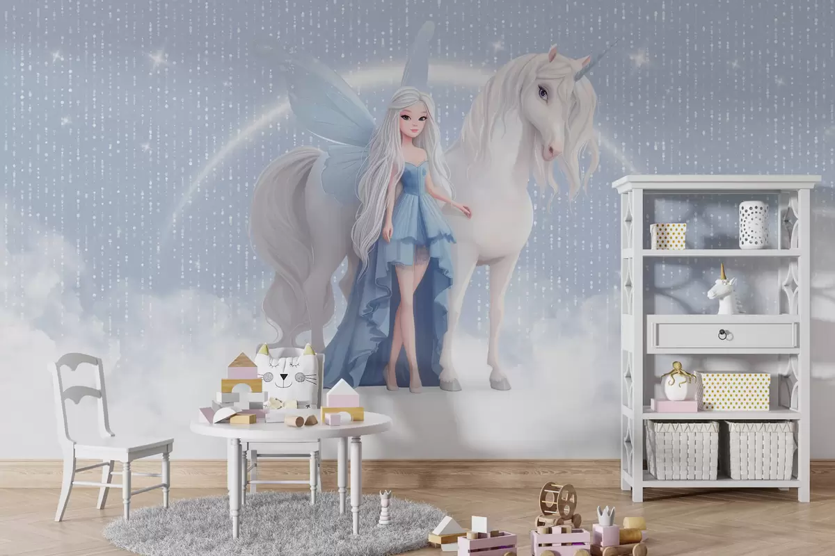 Papier peint Une fée avec une licorne dans les nuages N° w03527v1