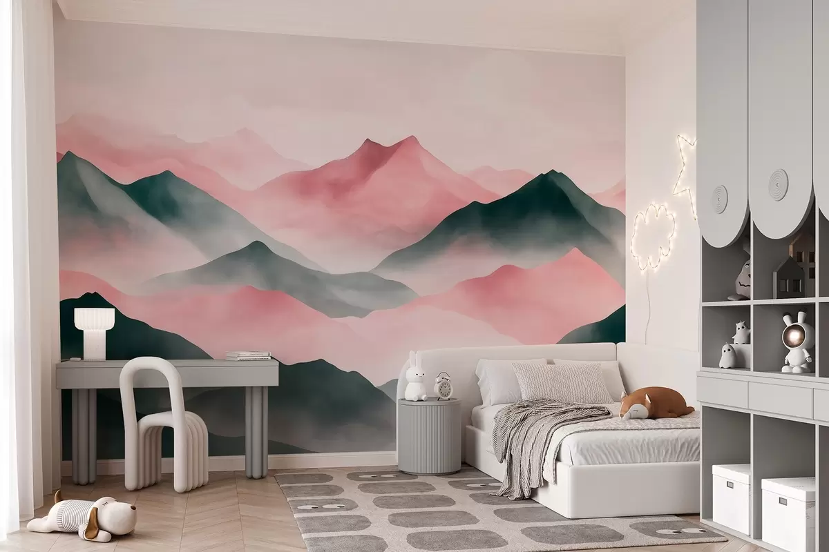 Papier peint Paysages de montagne, style aquarelle, brume, rose et gris N° w03548v1