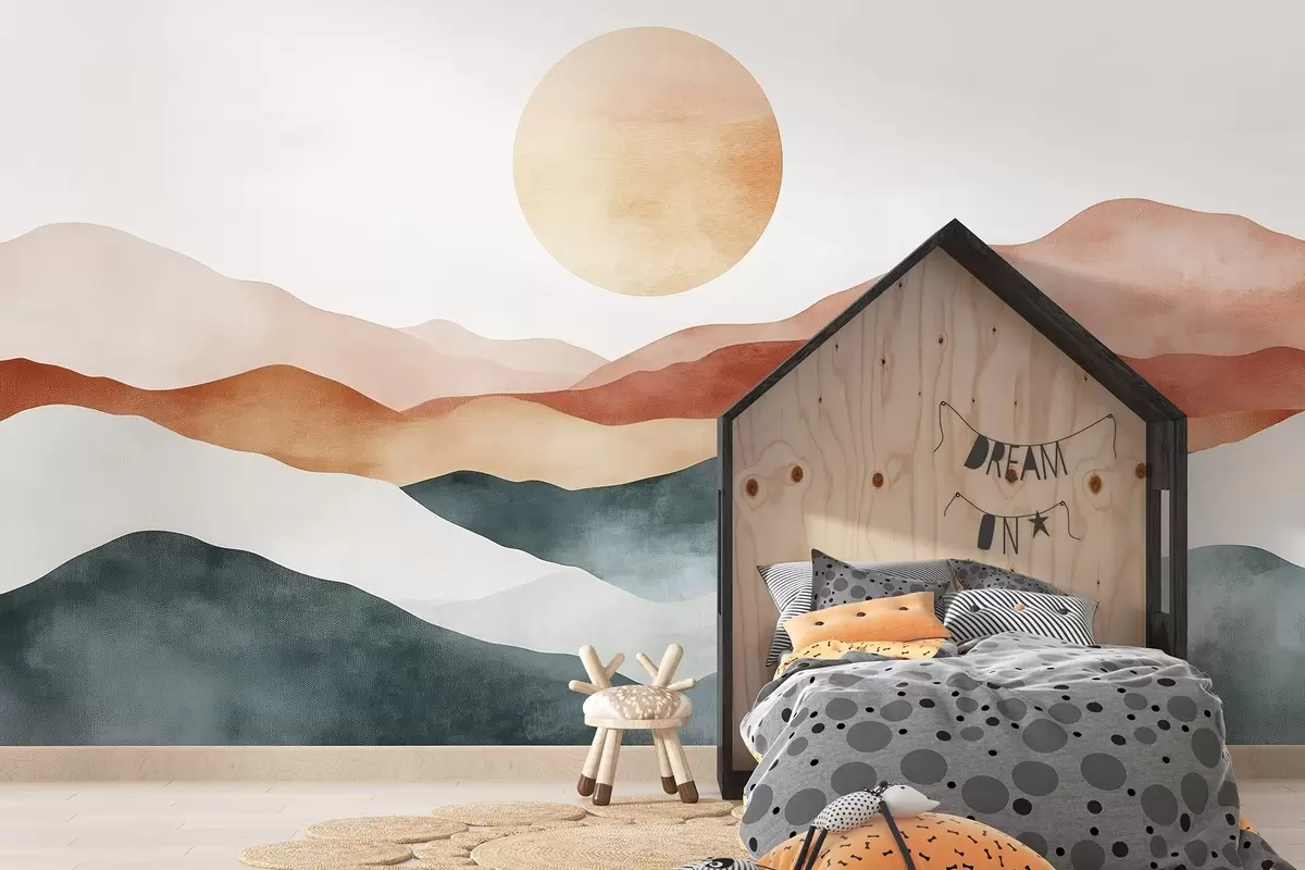 Papier peint Aquarelle de montagnes avec le soleil, style boho, rouge, orange, gris N° w03551