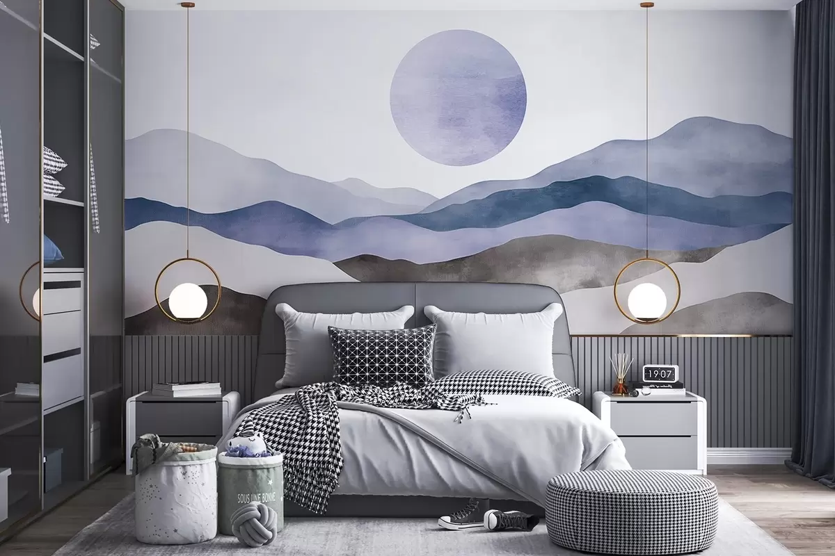 Papier peint Aquarelle de montagnes avec le soleil, style boho, violet, bleu, gris N° w03551v1