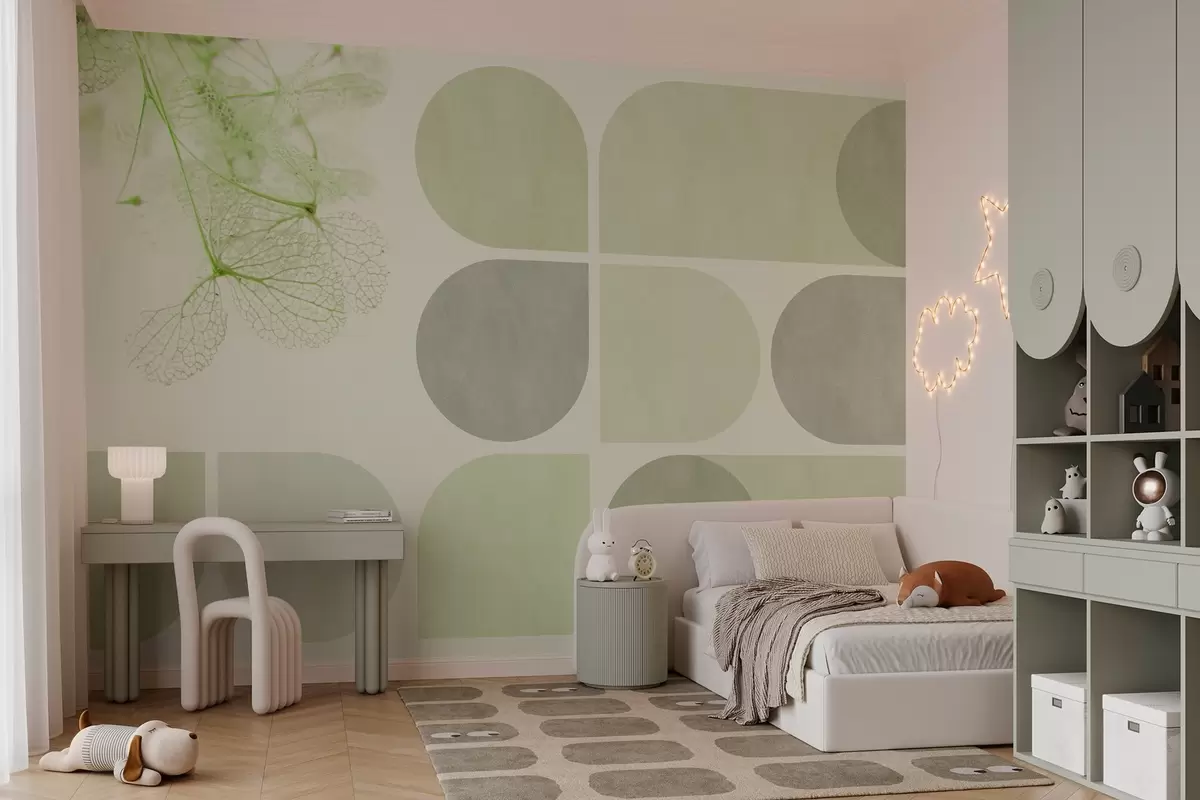 Papier peint géométrie et fleurs séchées avec des veines dans les tons verts N° w03617v1