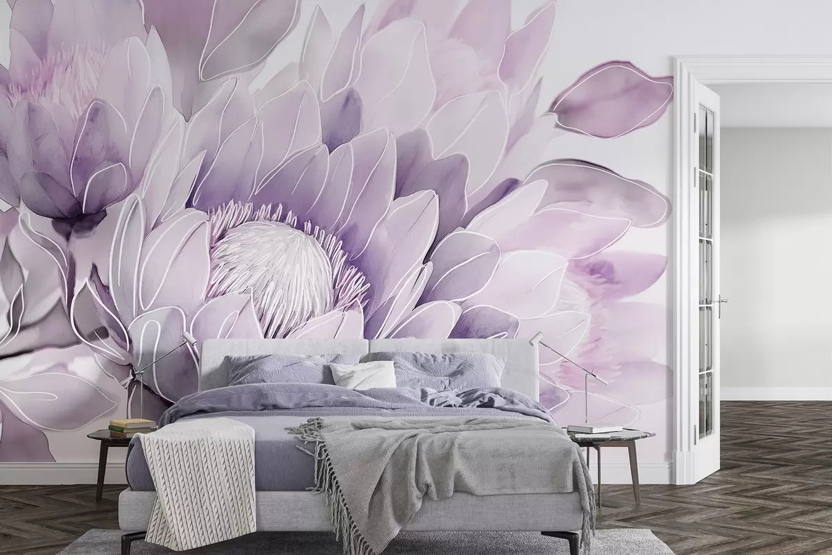 Papier peint Fleurs de protea, dessin au trait, tropical, couleurs violettes N° w03669v1