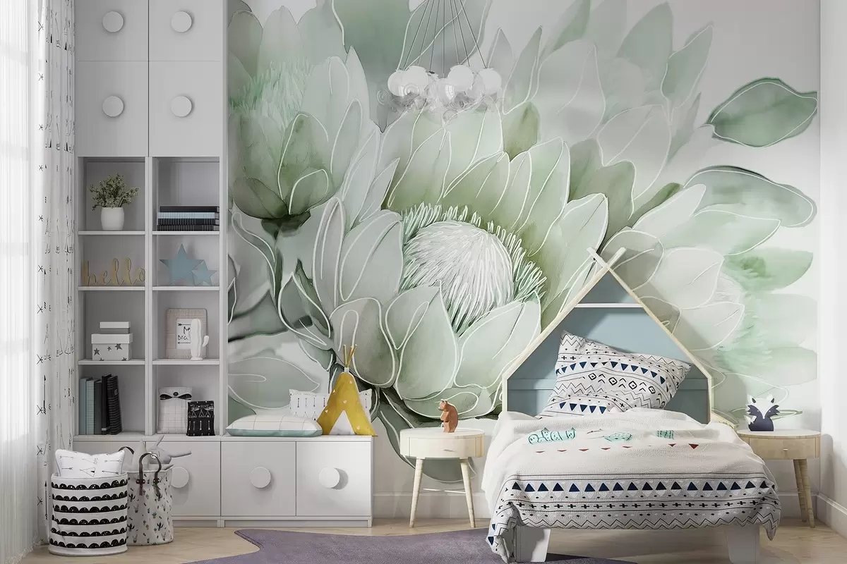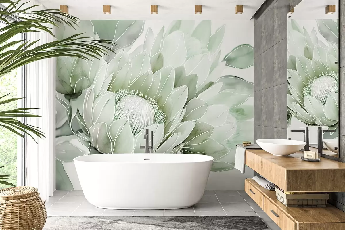 Papier peint Fleurs de protea, dessin au trait, tropical, couleurs vertes N° w03669v2