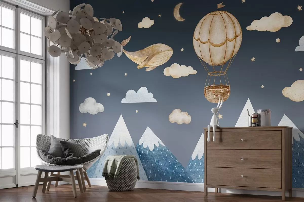 Papier peint Montgolfière, baleine mignonne, ciel étoilé, montagnes, aquarelle, couleurs bleu et beige N° w03672v1
