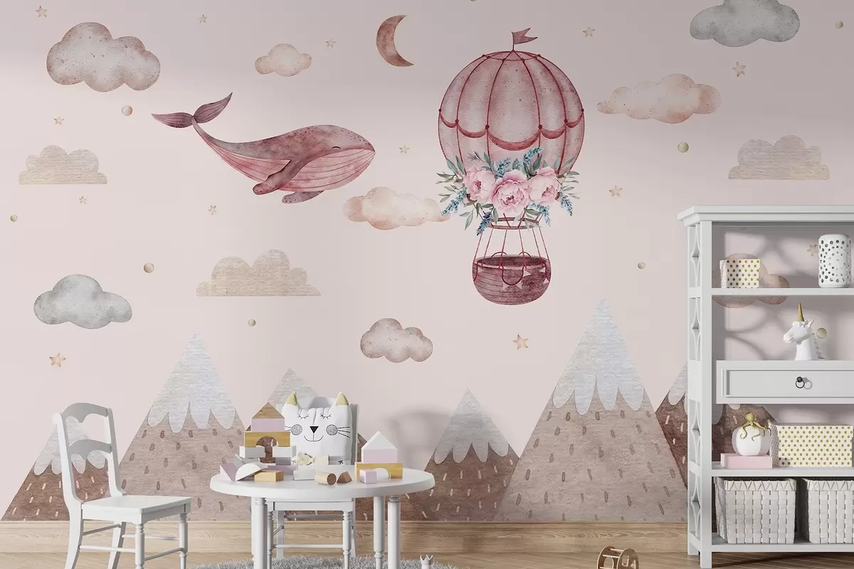 Papier peint Baleine mignonne avec ballon, ciel avec nuages, montagnes, style aquarelle, couleurs roses N° w03673