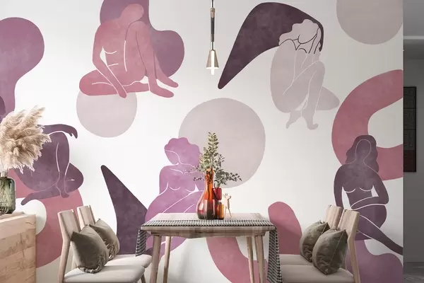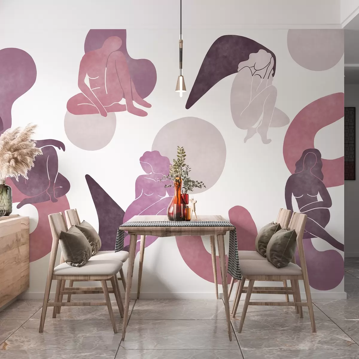 Papier peint Abstractions géométriques avec des silhouettes de femmes, style boho, rose, beige, violet N° w03753v3