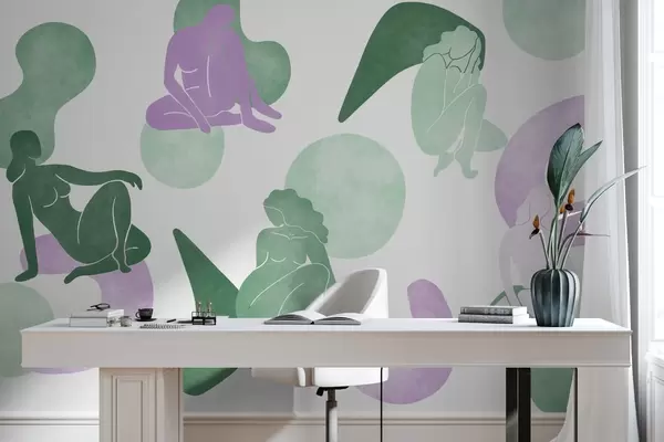 Papier peint Abstractions géométriques avec des silhouettes de femmes, style boho, violet, vert N° w03753v4