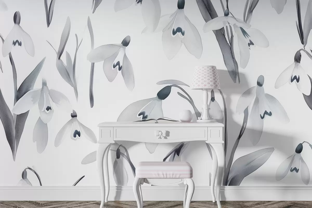 Papier peint Fleurs de perce-neige en style aquarelle, couleurs grises N° w03754v1