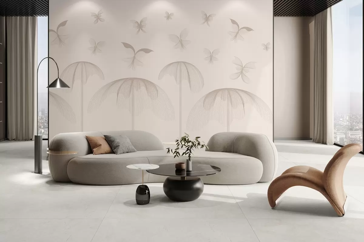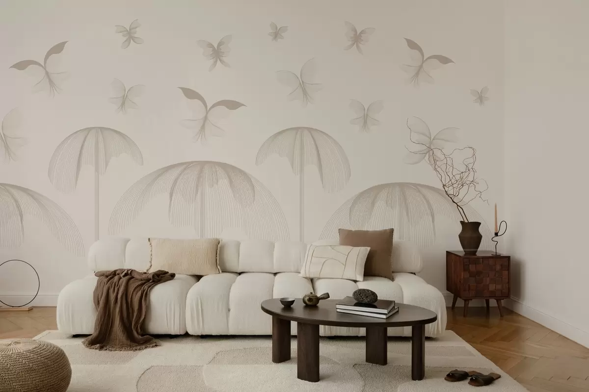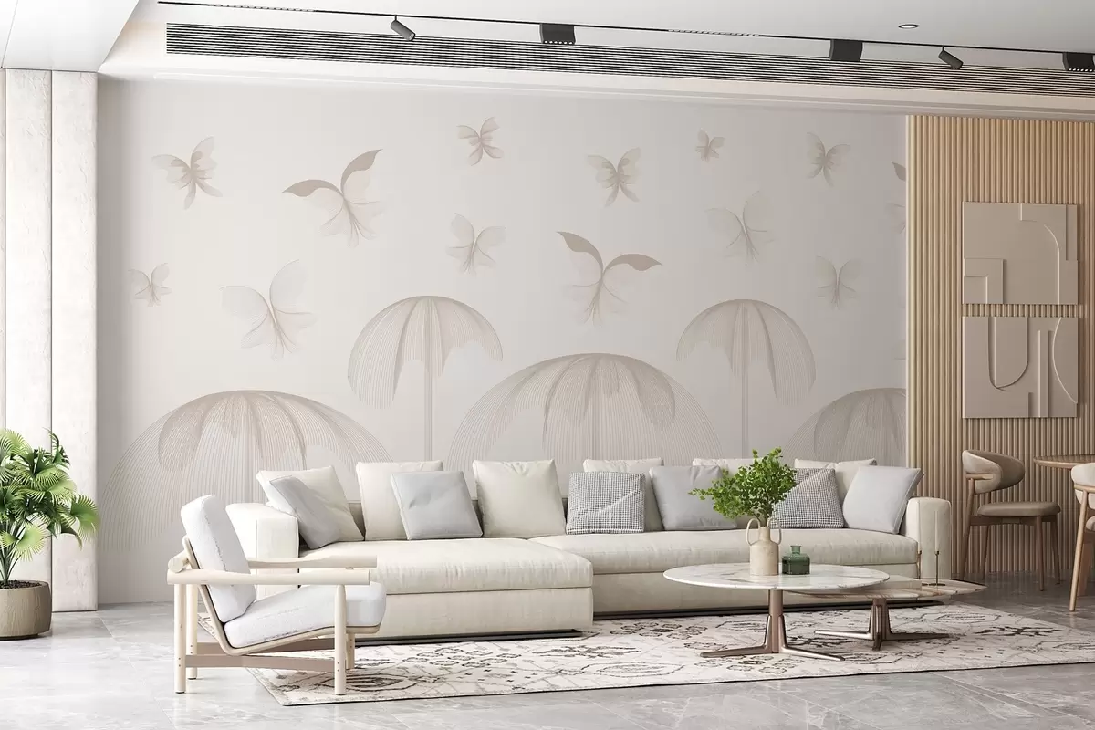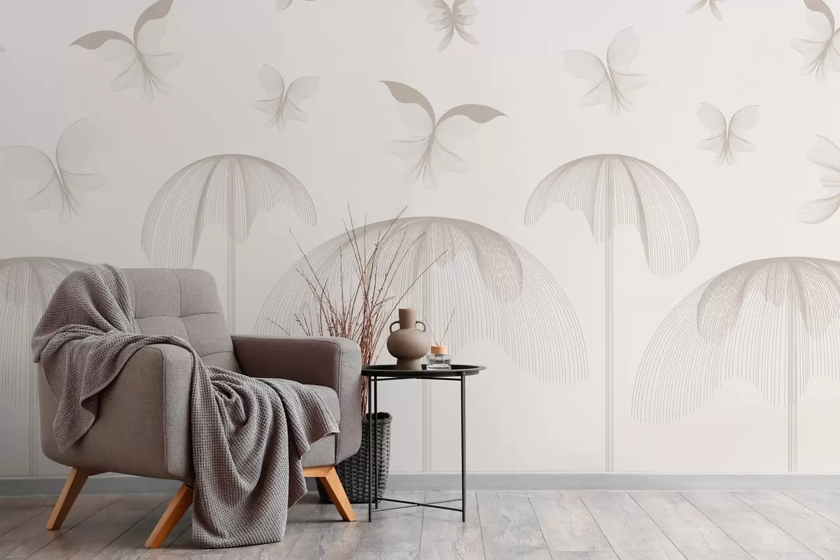 Papier peint papier peint linéaire minimaliste avec papillons et fontaines sur fond laiteux N° w03762