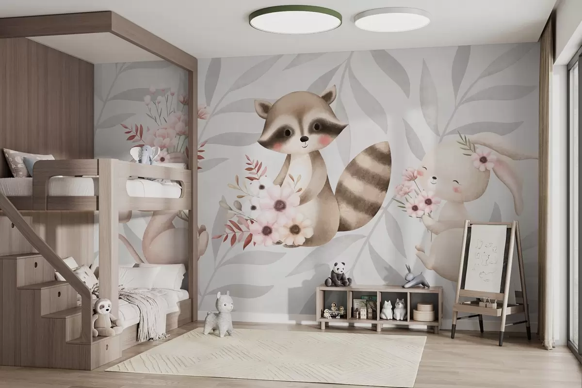 Papier peint Animaux de la forêt avec des fleurs N° w03861