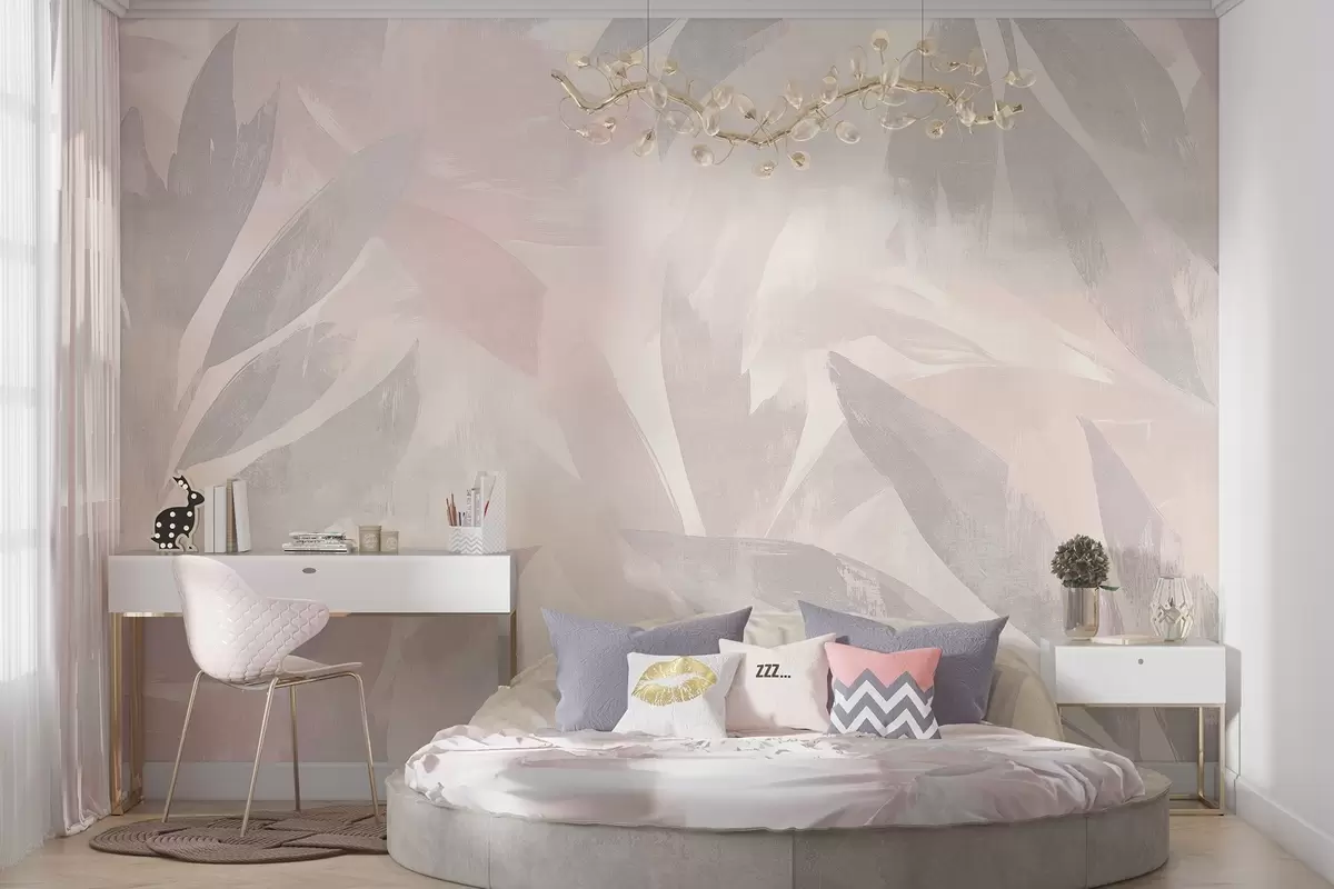 Papier peint Feuilles tropicales, fleurs, palmiers, style pastel, couleurs rose et beige N° w03881