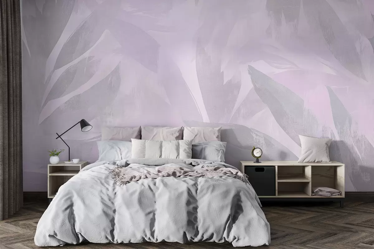 Papier peint Feuilles tropicales, fleurs, palmiers, style pastel, couleurs violettes N° w03881v1