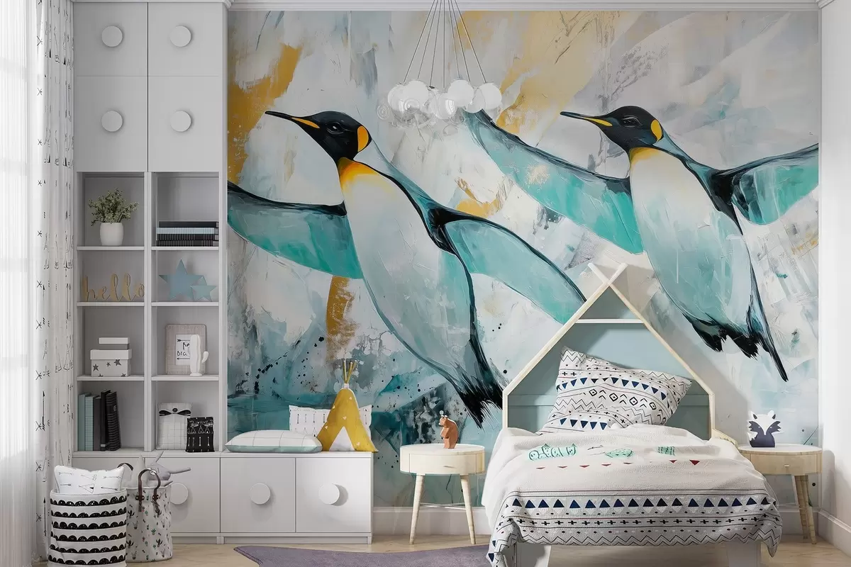 Papier peint Mignons pingouins, Antarctique, glace bleue, animaux, dessin à l'huile N° w03883